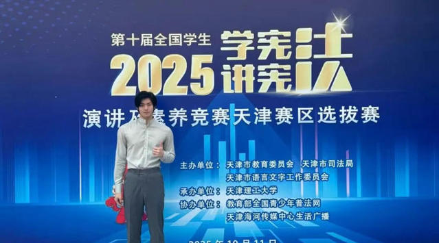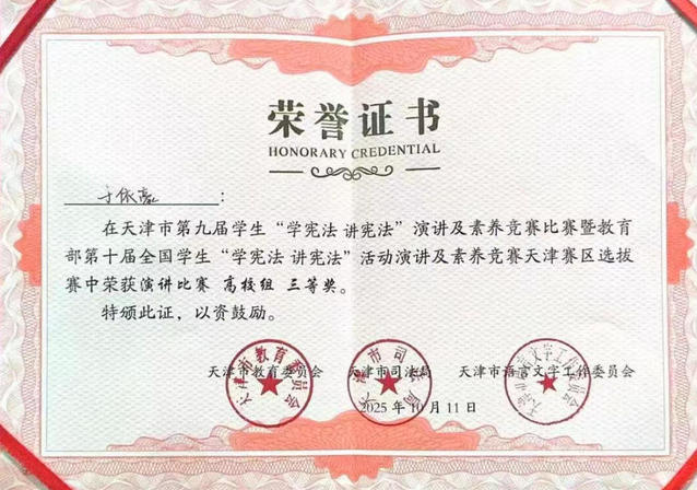 秋日传喜讯,赛场展风采。今天,从天津市“学宪法,讲宪法”活动天津赛区选拔赛现场传来捷报,我院学子于依豪凭借扎实的宪法知识储备、出色的临场发挥和昂扬的精神风貌,荣获大赛三等奖。这份沉甸甸的荣誉,不仅是我院学子个人能力的精彩展现,更是我院持续深化法治教育、培育青少年法治精神的丰硕成果。
