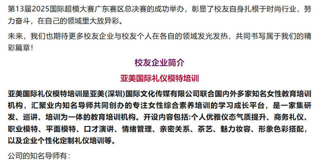 2025年10月26日,第13届国际超模大赛广东赛区总决赛在深圳圆满落幕。这场时尚与艺术的盛宴不仅展现了模特们的非凡魅力,更彰显了校友们的卓越风采。
